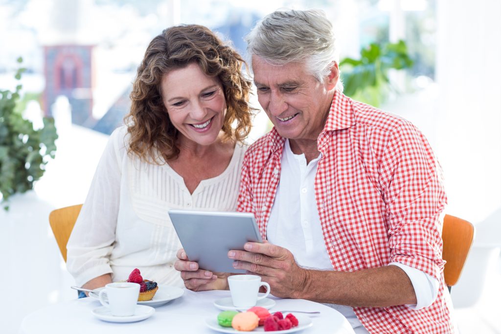 Happy mature couple looking in tablet computer while sitting by table in restaurant